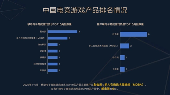 1-6月,流水排名前10的移动电竞游戏产品依次为射击类、多人在线战术竞技类、自走棋类、休闲类、棋牌类、非对称竞技类和动作类。热度排名前10的客户端产品中,有6款为射击类。