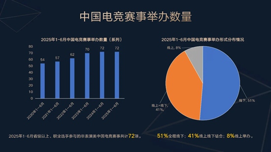 1-6月,参赛范围在省级以上,并由职业选手参与的非表演类电子竞技赛事,共举办72项,与去年同期持平。其中51%为全程线下举办,41%为线上线下结合举办,8%为线上举办。线上线下结合办赛同比明显增加。