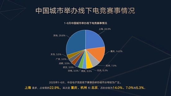 1-6月,中国电子竞技线下赛事举办城市分布较为广泛,上海仍为举办赛事最多城市,占比22.9%。其他依次为重庆、杭州和北京,占比分别为14.0%、7.0%和5.3%。