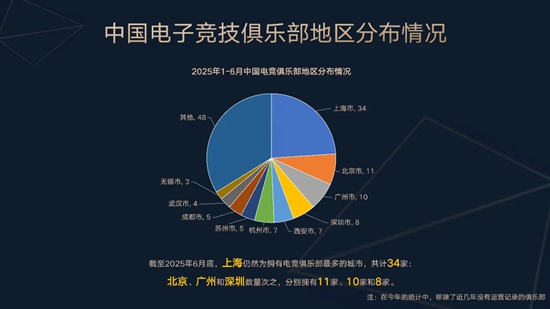 截至今年6月,上海仍然为拥有电竞俱乐部最多的城市,共计34家。北京、广州和深圳数量次之,分别拥有11家、10家和8家。
