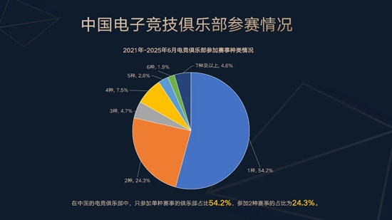 在中国电竞俱乐部中,只参加单种赛事的占比为54.2%;参加2种赛事的占比为24.3%;参加3种赛事的占比为4.7%;参加3种以上赛事的占比为16.8%。