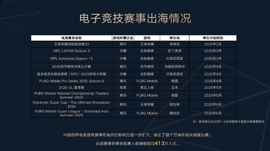 1-6月,中国电子竞技产业持续开拓海外市场,除东亚、东南亚等海外传统办赛优势区域外,影响力也在向拉美地区扩展。中国自研电竞游戏赛事在海外的影响力已明显扩大,头部赛事单场观赛人数峰值超过413万人次。