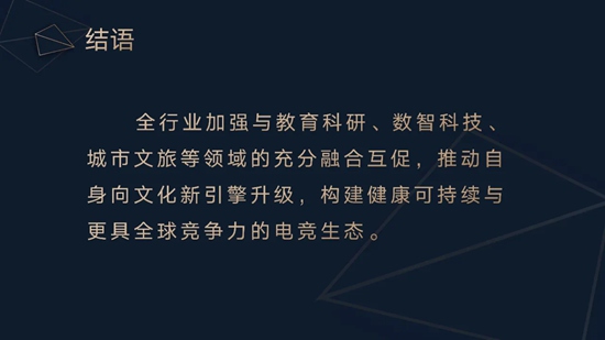 2025年上半年,中国电竞产业在市场收入、新品面世与赛事出海等方面均呈现增长趋势,已形成涵盖产品、赛事、直播平台、俱乐部和跨行业联动较为的完整产业链,正在规范化、主流化、国际化方向上稳步前行。未来,我国电竞产业应抓住政策利好和全民关注的有利机遇,不断推出高精尖电竞产品,打造健康精彩电竞赛事,积极投身国际赛场,在交流互动中强化自身影响力。践行这一愿景,需要全行业加强与教育科研、数智科技、城市文旅等领域更加充分的融合互促,推动自身向文化新引擎升级,从而构建健康可持续与更具全球竞争力的电竞生态。以上为报告摘要发布的全部内容,谢谢大家!