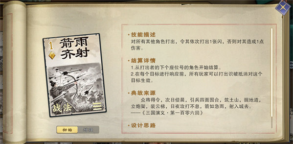 箭雨齐射是群体伤害的战法牌,其他角色如果没有闪,都会受到1点伤害,也能消耗目标的闪,方便我们(及友方)后续的斩杀。当然也要注意,如果己方武将没有手牌的情况下,不建议使用群体伤害类技能。