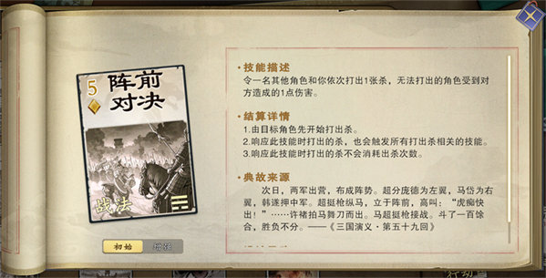 阵前对决在使用后,选择的目标与自身要依次出杀,否则会受到1点伤害。忠臣可以用此战法来消耗反贼手上的杀,在己方杀较多时也能用这张卡来取得优势,在消耗对方杀后,也能更好的保护自身及友方;这个战法也会消耗自己手中的杀,所以尽量在有2张杀以上时使用,在对方没有杀时,也可作为一种打伤害的手段。