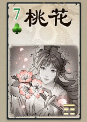 设计思路:桃花为木,生机勃勃,艮为生,点数为7;谐“逃之夭夭”,所以也可以免除伤害
