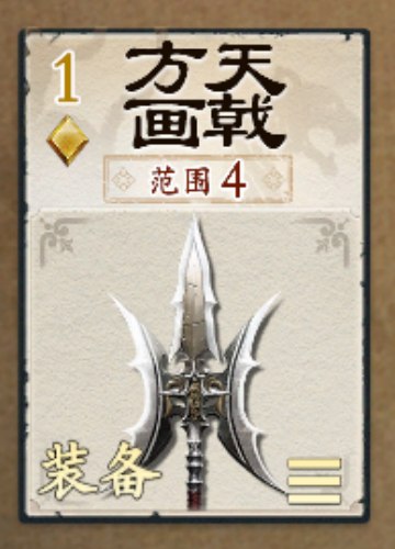 技能典故:双耳戟,戟杆上以画、镂等作为装饰,重二十四斤。《三国演义》中吕布所用。