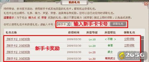 2、进入“我的礼包”界面后,在输入框输入您的新手卡卡号,输入正确的新手卡卡号后,于“我的礼包”界面领取相应的等级奖励。