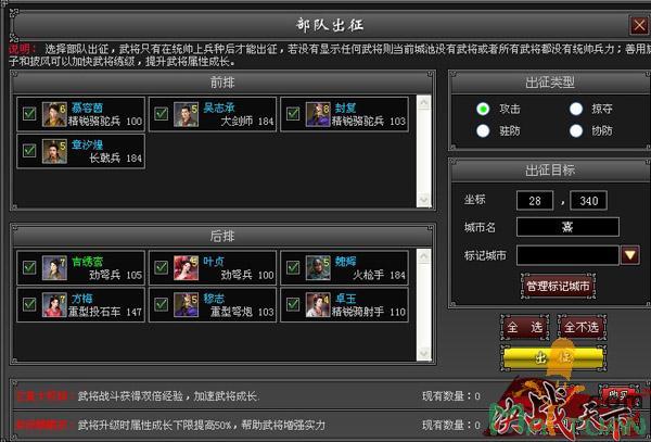 在《决战天下》里,你在点选“出征”时会发现有四项选择:攻击、掠夺、驻防和协防。如果你分不清攻击和掠夺的区别,那可就惨了。因为“攻击”是指与对方决一死战,直到有一方的兵力全军覆没时才会结束战斗;而“掠夺”却不然,选择掠夺,只是抢夺对方的资源而已。而“驻防”是指派遣部队到自己的野地进行防守,避免被其他玩家占领;“协防”则是指派遣部队到盟友城池,共同抵御外敌入侵。