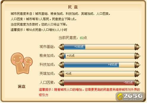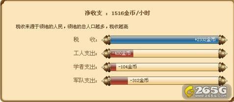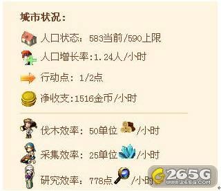 在城市中点击皇宫,可以看到你的内政界面。这是你城市的基本状况,你可以快速的查看了解你的城市人口、增长率、行动点、金币收支和百姓、学者等工作效率等的总体情况。