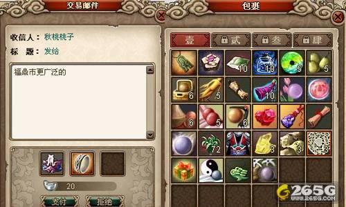 除了一般的撰写信件和首发信件功能以外,《武侠风云》中的邮件系统更可以实现邮寄物品和汇款的强大功能!玩家们若想送给好友一些道具、装备或者想要给好友寄去一些银两,可以直接通过邮件系统撰写普通邮件,在转写完信件后,把道具、装备放入邮寄物品栏中,更可以直接在汇款数额中填上汇款的数量,将信件、物品和银两直接瞬间递送到收件人的手上,绝无遗失和错发的可能,让玩家们用的既舒心又放心!