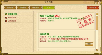 资源类涉及到木材、铁矿、粮草三种资源当前的生产情况,所以,要经常查看日常任务,说不定某一个状态下的资源生产情况就能获得日常任务的奖励哦。