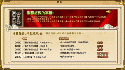 【新手推荐】算是制作方提供给玩家的一个帮助手册,根据寨主的不同级别,提醒玩家去达成各种成就、领取礼包等,真是细致、贴心。