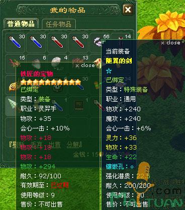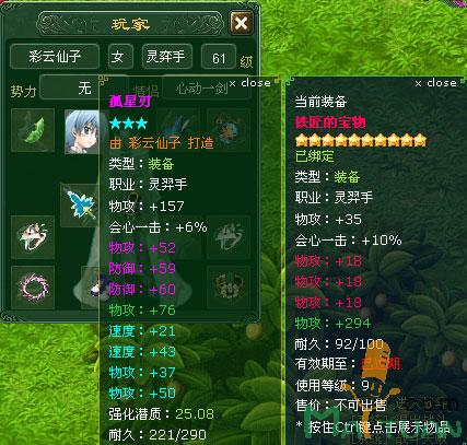 当玩家在鼠标移动到装备类物品图标上时,系统将自动搜索玩家自己身上已经穿戴了的相同类型的装备,如果有就将两个悬浮提示信息同时显示出来,如果没有装备同类型装备则不显示。玩家将可随意与自身的装备进行对比,可对比的装备包括:其他玩家身上装备、背包装备、仓库装备、NPC店出售装备以及其他玩家摆摊出售的装备。而且,玩家在聊天栏中展示出的装备,用鼠标点击后也会进行装备对比。
