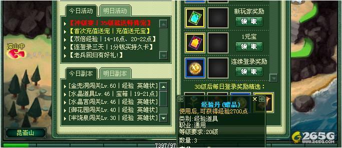 玩家连续登录3天的,可在每日领取界面领取“3个经验丹”奖励。使用后随机获得总经验5%份额的经验奖励。