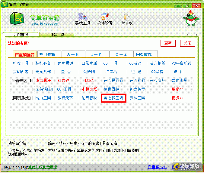 简单百宝箱是一款绿色、免费、安全的专业软件。全面收录了网游玩家常用的免费工具,每个工具都是工作人员精挑细选,免除大家寻找工具烦恼的同时,还提供一键式的工具下载、使用、管理、升级为一体的服务。