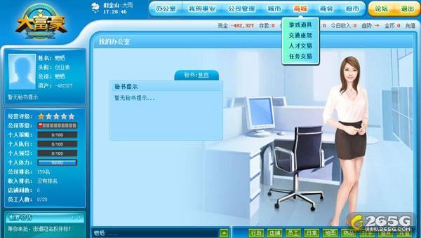 玩家进入打开新版的游戏界面图,进入我的办公室就可以看到如图1界面,魅力出众气质非凡的秘书便会出现在你的视野当中,窈窕多姿的美女秘书是不是已经让你心动?画面看起来不是很像你刚刚走进办公室,秘书迎面向你走来?