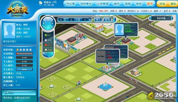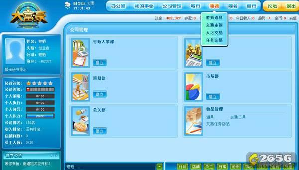 《大富豪》在界面布局上采用更合理人性化的布局,左侧全部显示玩家属性资料信息,轻松尽收眼底,上放是游戏的功能按钮,采用的是FLASH制作,只要鼠标轻轻一碰,就会展列出下拉菜单列表,各项功能选项任你体验。