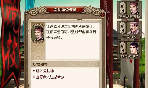 在《武侠风云》刚刚进行了更新的版本V1.1华山论剑中强势推出了全新的竞技场系统。玩家们进入龙凤王城的城门处即可看到竞技场的入口。进入竞技场后,就能够看到敬爱的竞技场管理员叔叔了。点击和他对话,可以选择进入竞技场或者查看自己的江湖辈分。玩家们的辈分是按照“飞雪连天射白鹿,笑书神侠倚碧鸳”从低到高排列的。每一个辈分都用自己的竞技场!