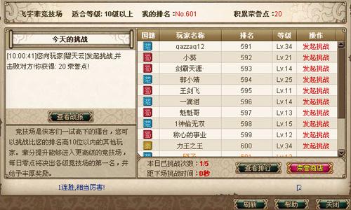 玩家们在竞技场中挑战胜利后,会赢得一定的荣誉值,此外,每天零时系统自动记录排名前100名的玩家,并且奖励额外的荣誉值。竞技场的辈分等级越高,可获得的荣誉值也越多!竞技场中有专门的荣誉值商店,在竞技场的战斗中攒下的荣誉值点数,可以用来购买商店里的高级装备和商城道具,进一步提升玩家们的实力!如果你不想在江湖中是个无名小辈,那就快来竞技场中大展身手吧!