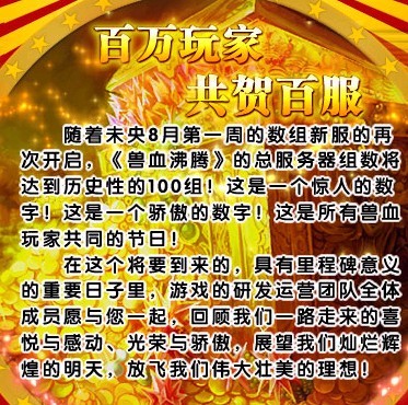 今日(8月7日),随着三组新服的开放,由热门玄幻小说改编、09年最成功网游《兽血沸腾》,服务器总数达到100组,游戏首次呈现百服同爆满的壮观盛况,同时也标志着游戏进入了一个崭新的百服时代。