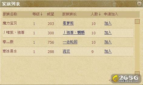 在此次的梦幻内测中,家族系统自然也是一大重头戏,也是十分受玩家欢迎的。从进入游戏伊始,就有不少玩家大嚷着看谁能第一个创建家族。很多人都为此目标在努力的冲级赚钱。终于笔者兴奋的在刃雪城家族管理员绮烟处看到了已经创建的的4个家族。