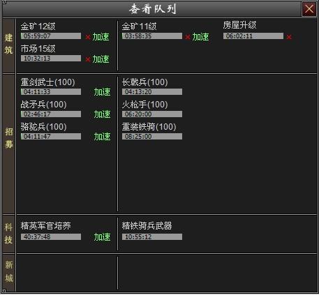 “丁公宝典”“鲁公秘籍”为你增加建筑队列,建筑等候队列各一。建议使用分配队列模式“粮田+伐木场+民居+任意军事建筑”或“采石场+金矿+民居+任意军事建筑”。为什么这么做?因为这样的发展将会保证你的资源平衡,同时更可以保证你的人口始终能够支持你的资源建筑升级。