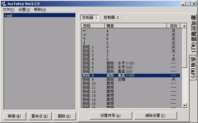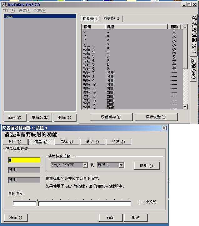第四步、打开JoyToKey V3.7.9 汉化版,依照“设置向导”或者是直接双击打开方向或者键名数字进行对应键盘设定,我设定的手柄键3为对应J键,即炮弹发射键,需要对它进行一下自动开炮,注意图中的自动连发