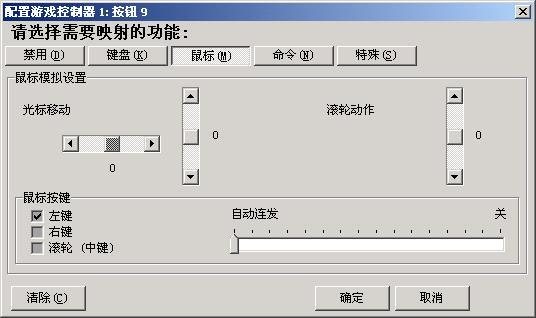这里我设定的是手柄顶端的4个按钮,左面的是控制鼠标的上下移动,右面的是控制鼠标的左右移动,至于鼠标左键的确定操作,我设定由我手柄的“START”确定按钮来完成,大家设定的时候可以参考。