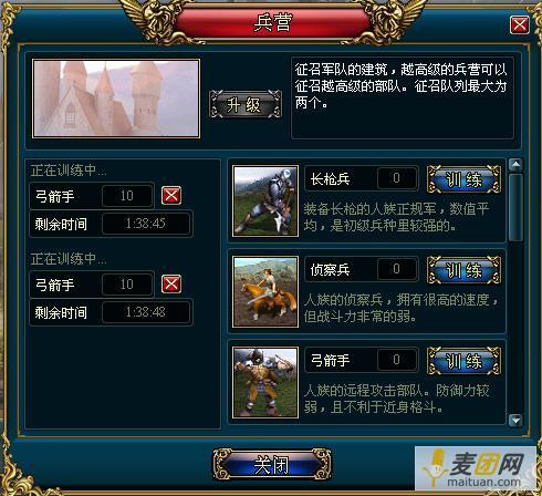 在网页游戏《雷霆之巅》中招募部队都是在兵营中进行,可以2个队列同时训练,如果你想快速出兵的话,那么就不要点太多的兵,隔一定的时间点几个,这样能使你手上一直有兵用。当然你长时间不上线的话,可以肯定再次上线的时间造更多的兵,最多100个每列,前提是你有足够的金钱。