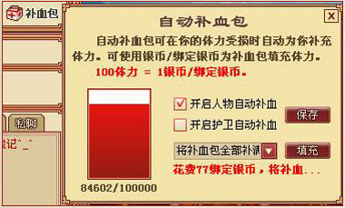 在战斗小助手处设置战斗次数,就可以自动打怪了,同时还可以为你拾取战利品。这个时候你要关心的就只是自己的血量是否足够。可为了完全免除你的后顾之忧,配合战斗小助手,我们一起开放了自动补血包。自动补血包内含100000hp的血量,从此,不管是刷怪还是打boss,你都可以高枕无忧了。