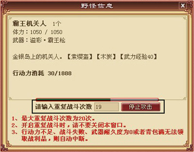 在战斗小助手处设置战斗次数,就可以自动打怪了,同时还可以为你拾取战利品。这个时候你要关心的就只是自己的血量是否足够。可为了完全免除你的后顾之忧,配合战斗小助手,我们一起开放了自动补血包。自动补血包内含100000hp的血量,从此,不管是刷怪还是打boss,你都可以高枕无忧了。