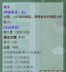青牛:[等级需求:无]坐骑。七夕活动装备。骑乘者将获得强大的能力。