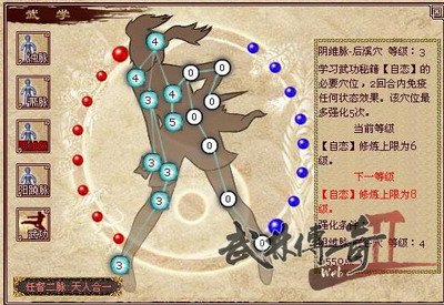 《武林传奇2》从人体的12大经脉挑选了“任脉”、“督脉”、“冲脉”、“带脉”、“阴维脉”、“阳晓脉”六大经脉作为游戏角色的六种基本能力。除正常的经脉外,还在这六条经脉上分布着约共66个穴位。