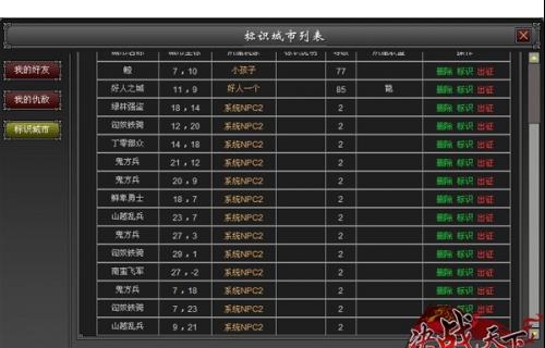 至于关系模块,它主要针对的是个人玩家。每个玩家都可以在关系模块中添加自己的好友,或者设立仇敌。而对于需要关注的野外NPC,你大可不必费心的去牢记他们的坐标,只要“标识城市”,即可随时出征讨伐。朋友还是敌人,在这里都将一目了然。