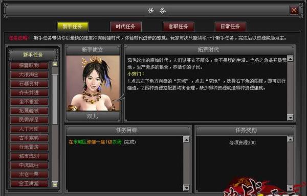 一进游戏大家都是一贫如洗,这样的处境如何能让我们在复杂的环境中赖以生存,用我们这位热心玩家的话说,那就是“跟着任务走呗”,哈哈。听起来也许我们会笑一笑,但是其实真的是再实在不过的一句话。使女双儿带你一路顺畅的完成所有新手任务,而且新手有三天时间的保护期哦,这三天内你不会被任何人攻击和侦查,足够保证现在弱小的你不被侵害!黑暗时代要注意的问题呢主要有三点: