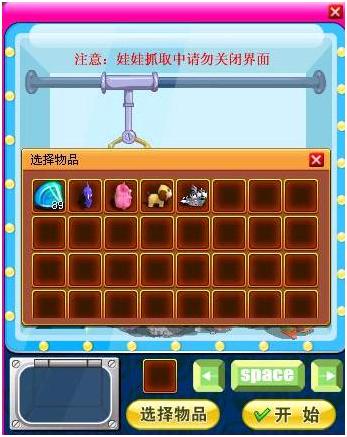 鼠标点击娃娃机会打开游戏界面,单击操作界面中的选择物品按钮,放入背包中的多尔石。
