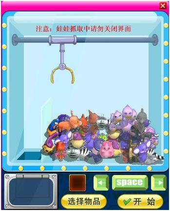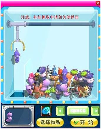 放入多尔石后点击开始移动爪子即可开始抓取娃娃,键盘中的左右方向键可用于移动爪子,空格键用于确定下爪(以上操作也可使用鼠标点击界面上的相应按钮)。开始后,将有30秒的时间用于确定下爪位置,倒计时结束后爪子将自动落下。