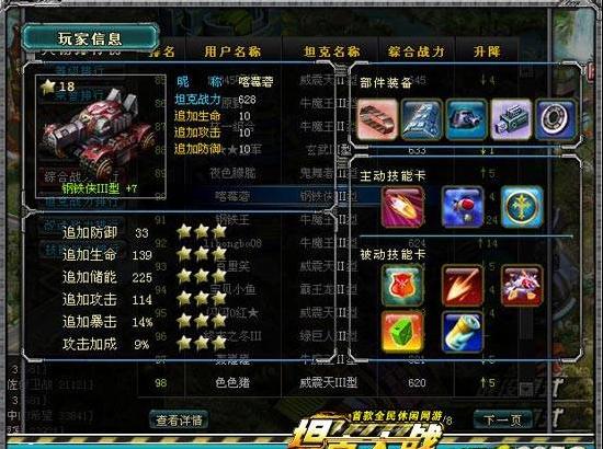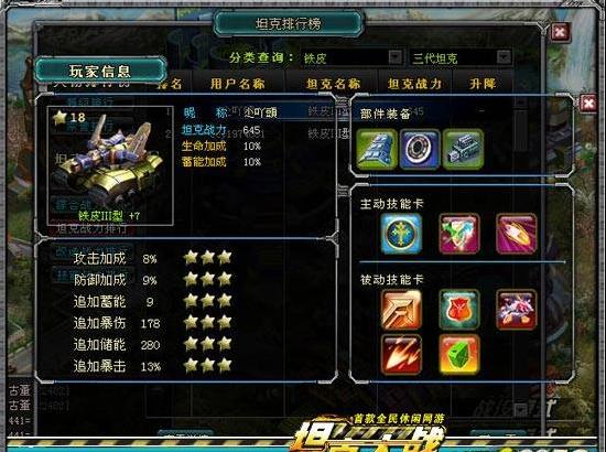 大家在有了足够的银币之后就可以换乘更加强悍的坦克,铁皮、闪电侠、奥特曼到时候也会默默的驶进坦克仓库等待玩家的再次召唤。不过也有十分有爱的玩家不愿意舍弃伴随他们成长的坦克,来看看这位玩家竟然把铁皮强化到了第三代,真是一位有情有义的痴情汉子!