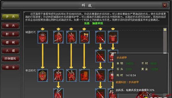 升级科技可以提高玩家的军队攻击力,增加部队的生命值。但一看上面耗费的时间和资源总是让人郁闷,在这种时候,我们就要有选择的先升级一些科技。总体来说,前排的先升体,后排先升攻,探子先升间谍。