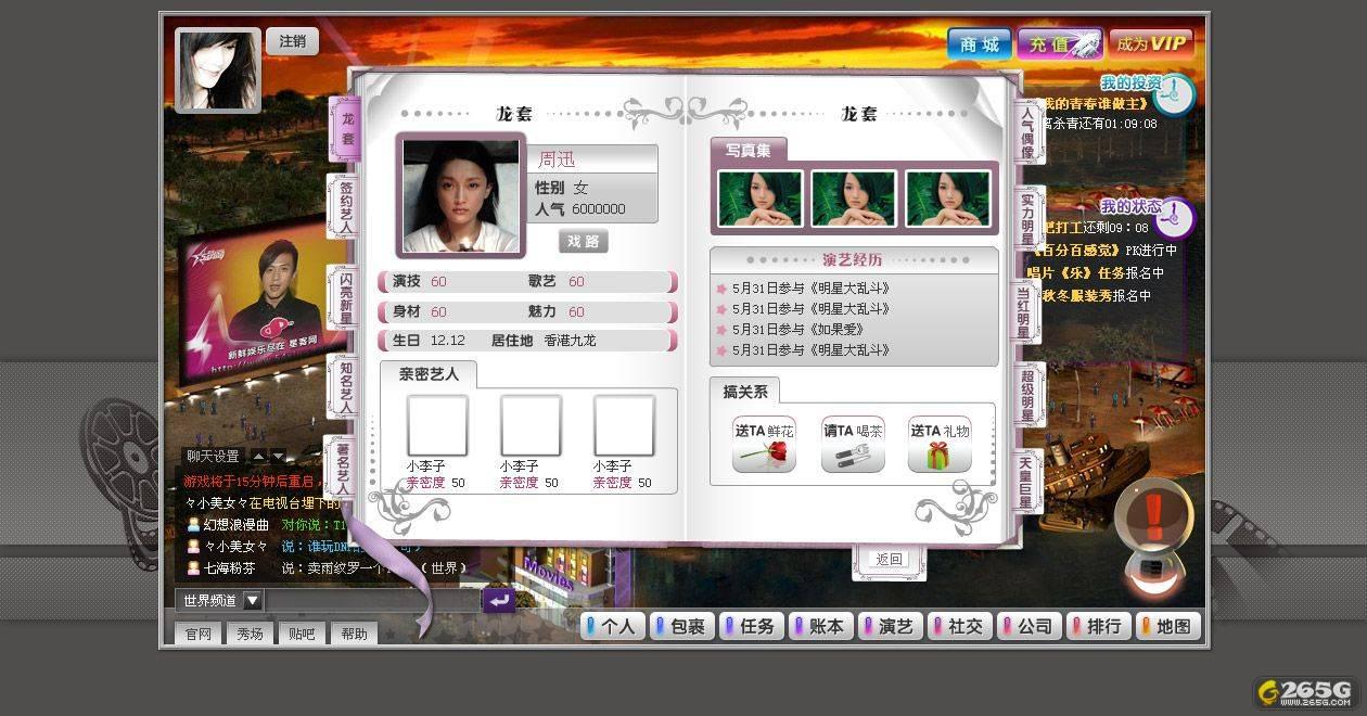 《星客志愿》邀您共建娱乐圈、品尝娱乐的味道!在这里,你将作为艺人从“龙套”成长为“天皇巨星”,你将与刘德华、章子怡、李宇春等明星们PK竟角,出演影视剧、举办演唱会。你还可以给仰慕的明星们送花、送礼物,更可以向她们发起挑战、超越她们!来吧,你就是未来的“星客奥斯卡”得主,无限荣耀属于你!
