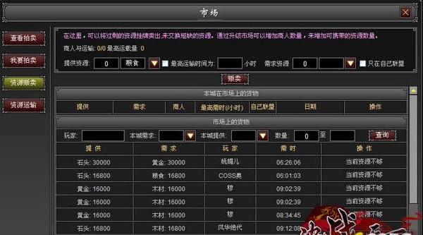 或许初出茅庐的新手来说,资源的重要地位还不是很凸显,自己城池的生产力还能够支持。但是随着你的城池不断地发展,资源短缺问题会越发的让你挠头。这个时侯,市场的作用就显现出来了。《决战天下》里的市场系统中,最常用的大概就是资源交换。玩家可以将自己过剩的某种资源挂牌出售,并以此来交换自己所短缺的资源种类。这样,既不会造成浪费,还能够达到玩家之间资源互补的效果。