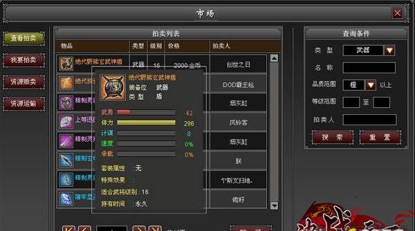 如果说资源交换和运输两个功能属于资源的互补,那么拍卖绝对是展示玩家们商业头脑的好地方。装备、魂珠、材料、宝箱……只要不是已经绑定的物品,绿色品级以上,包括绿色品级的所有东西都可以被挂牌出售。