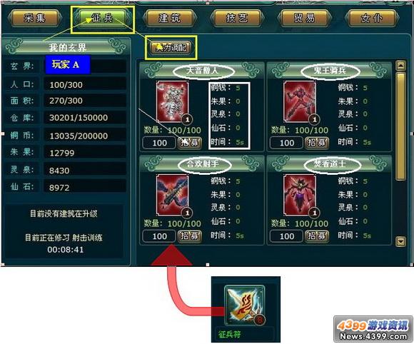 下面开始介绍游戏中的战斗功能——“征兵”。玩家们进入4399《盘龙神墓记》的游戏后http://web.4399.com/plsm/,在功能菜单中点击“征兵”,即可进入“征兵”界面,界面会显示当前可招募的五种兵种:天音僧人、鬼王骑兵、合欢射手、焚香道士、青云剑修。
