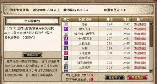 每个竞技场中,玩家只能够去主动挑战比自己排名高1—10位的其他玩家,同时也能够挑战比自己低10个等级的玩家。如果挑战比自己高等级的玩家成功,则占据目标玩家当前的排名位置,而目标玩家则跌落到原挑战玩家的位置。如果挑战失败,则双方排名不发生任何变化。如果双方战平,则名次也不会发生变化。每挑战一次消耗日常挑战次数1次。如A玩家排名90名,去挑战85名的B玩家,挑战成功后,则A玩家的排名为85名,而B玩家则排名掉至90名。每天零时系统自动记录排名前100名的玩家,并且奖励额外的荣誉值。竞技场的辈分等级越高,可获得的荣誉值也越多!此外,只要挑战成功,就可以获得荣誉值哦!