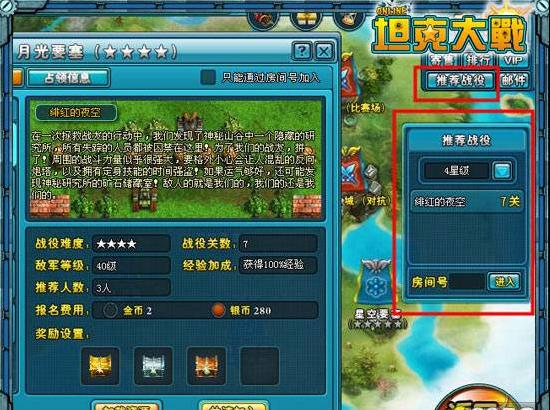 除了直接点击战役地图进入战役选择之外,新版坦克大战还推出了“推荐战役”功能。推荐战役功能按钮在游戏界面的右上角,商城按钮下方。轻轻点击按钮,就会弹出推荐战役对话框,选择你想要参加的星级,系统将根据你的等级为你推荐最适合的战役。