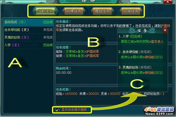 选取好了国度,进入4399盘龙神墓记游戏界面系统会自动的弹出新手人物引领,玩家可以根据这个新手任务引领熟悉游戏的一些操作内容,完成自己对游戏的第一次接触熟悉游戏的玩法。在做新手任务的时候我们也可以看下整个游戏画面也是非常炫彩好看,还可以体验下小说中的御剑飞行的修仙境界。