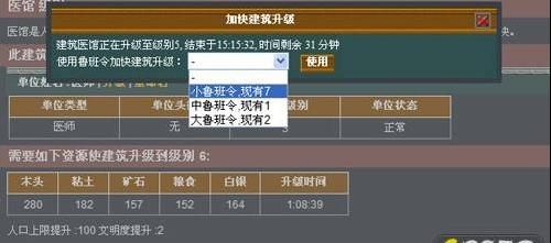 大鲁班令:使一个正在升级的建筑升级时间缩短3小时,最低缩短到1分钟