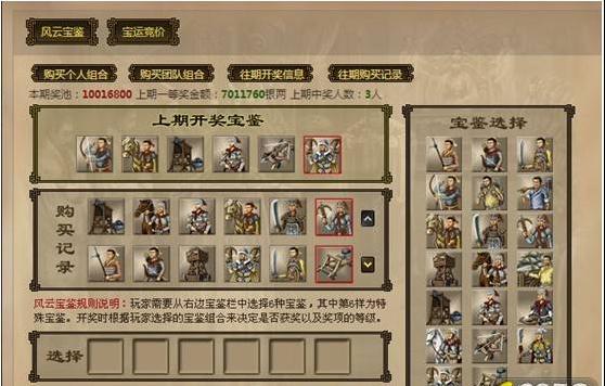 | 风云宝鉴 | 类似于双色球的玩法规则,玩家需要在20个宝鉴中选择6个宝鉴做为一个宝鉴组合,如果该组合和与系统开出的宝鉴组合相同或相近,则中奖,并可以获得游戏中的相关奖励。 | 双色球 |