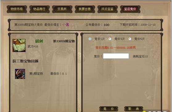 | 宝运大竞价 | 系统会在一个周期内,拿出一件极品装备出来作为“宝运大竞价”的奖品,玩家可以在0.01-99999.99这个出价范围中选择一个价格出价,当竞价结束后,所有竞价中价格为唯一并是最低价的出价者,可以获得该极品装备。 | 开运夺宝 |
